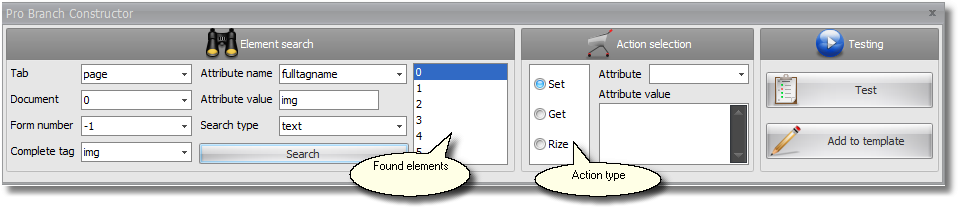 First, fill in the element's address being guided by highlighted elements to compose your search. Then press the search button and as a result you get the elements satisfying the search parameters. Following, you choose the element required. If you activated Branch Builder form the menu, this element is already found.