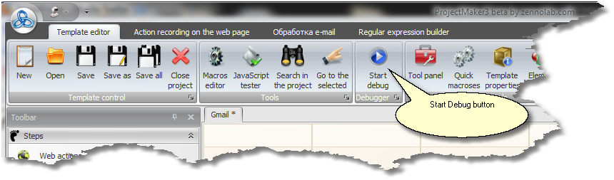 Using the 'Next' button you will be able to browse through all the steps and branches of the template. Each time you press this button, a branch is executed, which means you can watch in detail an entire step-by-step process of executing the template and detect the errors, if any. The branch currently under processing is marked - it displays a bold title. When debugging you cannot edit the template, however you can see results of working macros, for example, in the Element Properties Panel. The Action Log records all the details about the execution of each branch.