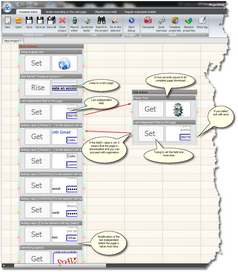 Double click with the left mouse button on the exit point (the green point signifies an error-free exit, while the red point signifies and error-triggered exit) of the first branch and then on the entrance (the blue point) of the other branch. The two branches will be connected with a red arrow. |