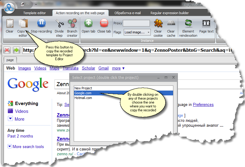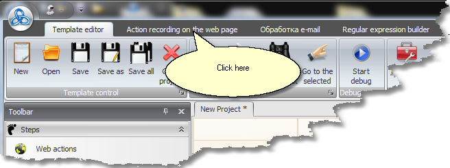 For web page analysis use the following panels: 'Elements Tree', 'Highlighted Element Properties' and the 'Page Text' window. After you are through with recording your actions the newly created template should be copied to Template Editor. For this, press the 'Copy to Editor' button and choose the name of the template where you wish to copy the recorded template to (?) (In the window that appears double click on the name you require).