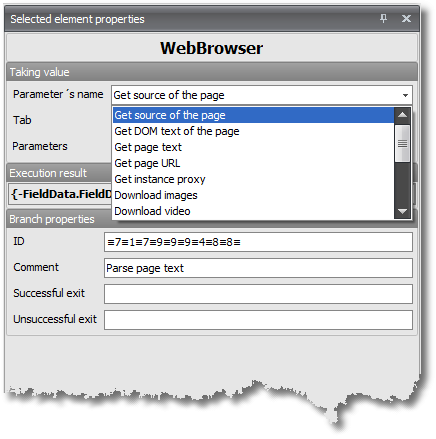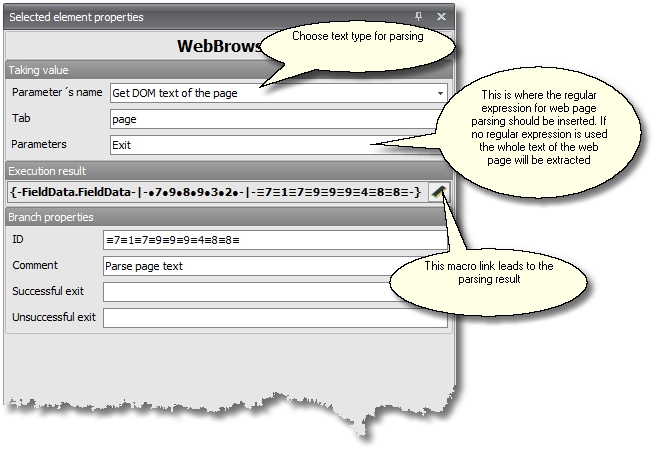 You create a branch of the Get -WebBrowser type. This branch will extract web page text; parse it with a regular expression preset in the branch's parameters. The regular expression will be parsing the web page text for the specified phrase or word. The regular expression and the text it is parsing for coincide in 95% of cases, that's why more often than not you will not have to use the tools to test the regular expression in the web page text. You should also know that the nature of web page text can be different: