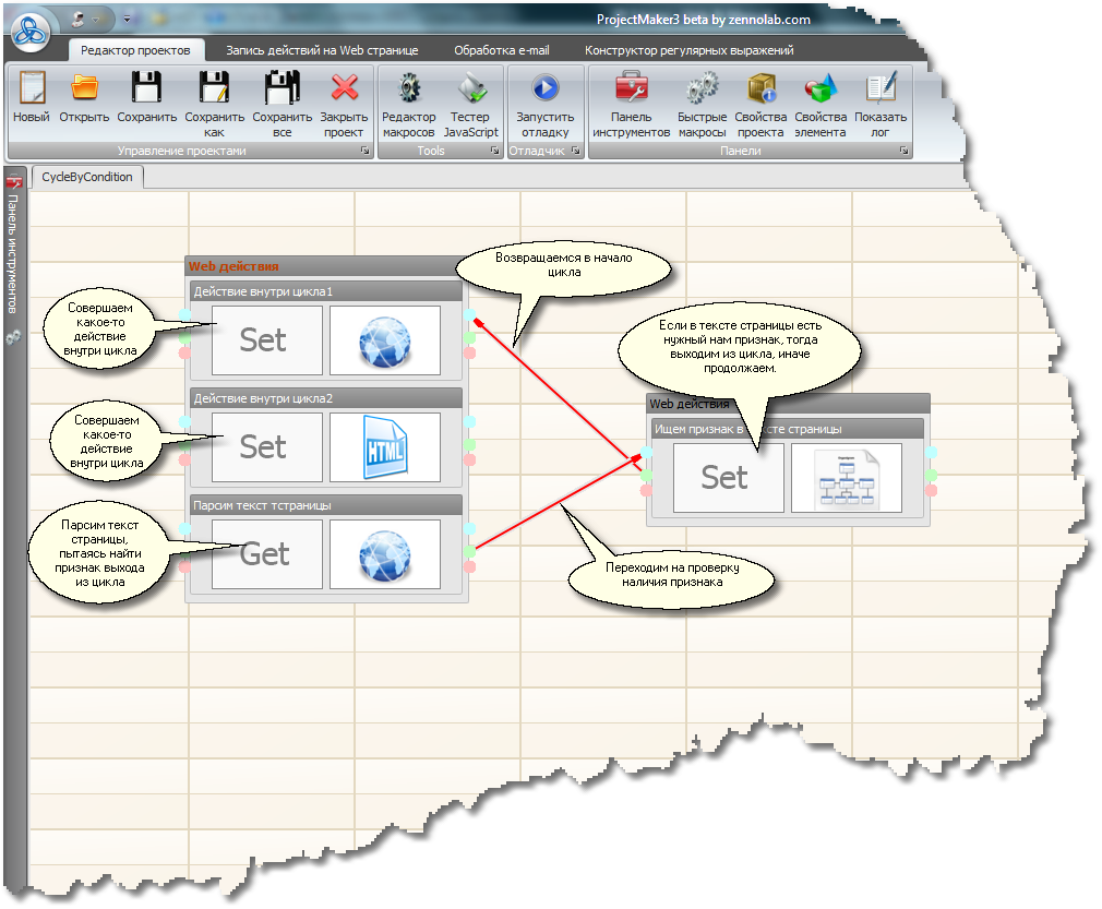 Самый простой случай, когда вы не знаете сколько раз отработает цикл и не знаете условие конца его работы, но знаете, что в один момент произойдет ошибка выполнения шаблона и цикл прервется. Так, например, может быть, если вы при парсинге поисковика нажимаете в цикле кнопку "далее", когда страницы выдачи кончатся, эта кнопка пропадет и цикл закончится ошибкой (см. пример в разделе парсер). Ошибка тут совершенно не значит, что у вас все пойдет не так, ошибка - это просто выход из шаблона при проблемах выполнения веток, в данном случае эта ошибка нам помогает закончить цикл.