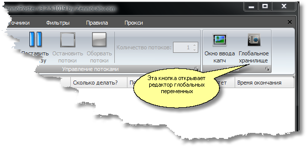 В этом редакторе можно задать какое-либо значение для использования его любым шаблоном, работающим в любом потоке. Открыть редактор глобальных переменных можно в ZennoPoster'e (или в ProjectMaker'e такая же иконка)