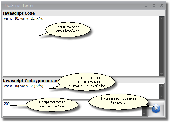 Естественно, если вы написали код на JavaScript, его нужно протестить. Откройте ProjectMaker в редакторе шаблонов наверху в панели управления, найдите кнопку "Тестер JavaScript" нажав ее, откроется такое окно: