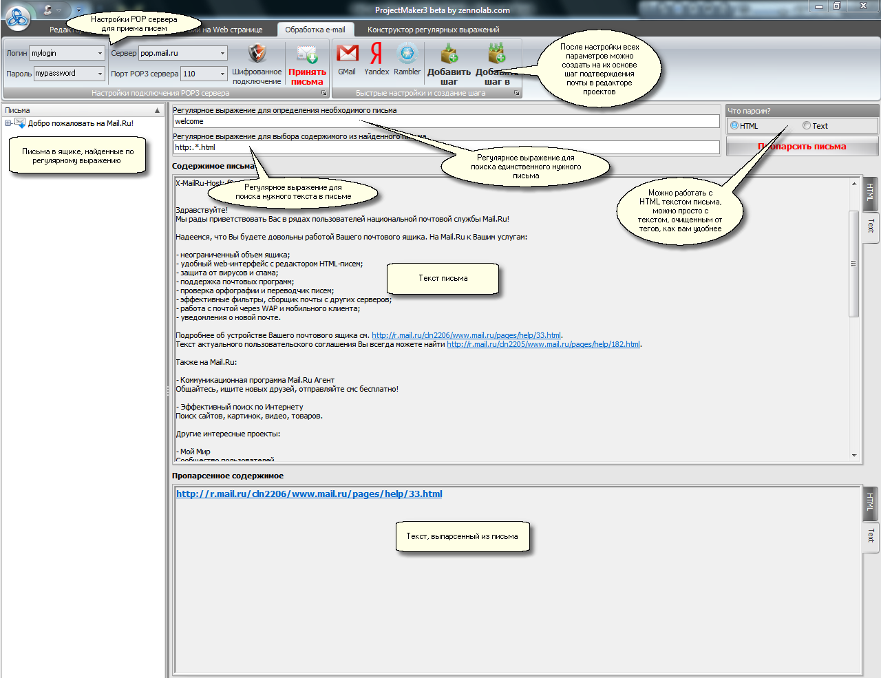 | 4. | Далее нужно составить регулярное выражение для парсинга нужного текста из письма, для этого опять используйте текст письма и конструктор регулярных выражений. Вставьте составленное регулярное выражение во второе поле и снова нажмите кнопку "пропарсить письма". В нижнем окне появится результат парсинга. Если вы правильно составили регулярное выражение, то там будет текст, который вам нужен (ссылка или какие-то данные, например, пароль). Обратите внимание, что вы можете парсить оригинальный текст письма с HTML тэгами (часто письма посылают в виде html страницы) или просто текст, очищенный от тегов. Смотрите, для какого варианта вам будет удобнее составлять регулярное выражение. |