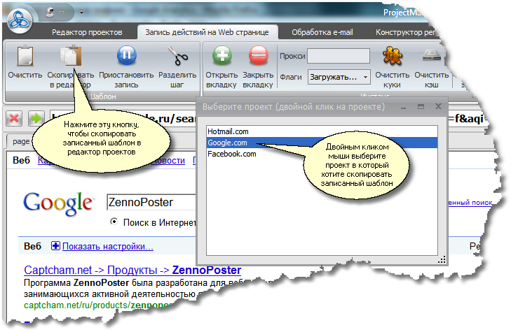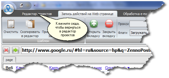 Для анализа текущей страницы используйте панели: "Дерево элементов", "Свойства выделенного элемента" и окно "Текст страницы".После окончания записи действий нужно перенести записанный шаблон в редактор проектов. Для этого нажмите кнопку "Скопировать в редактор" и выберите название проекта, в который хотите скопировать записанный шаблон (?) (в появившемся окне кликните по нужному названию двойным кликом мыши).