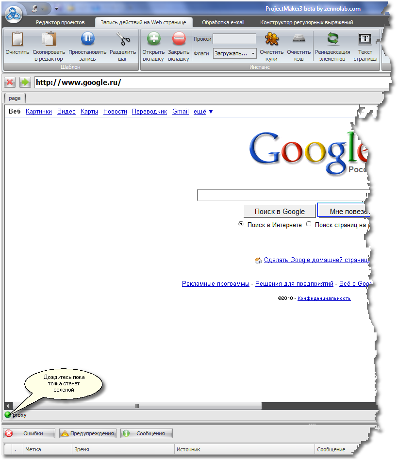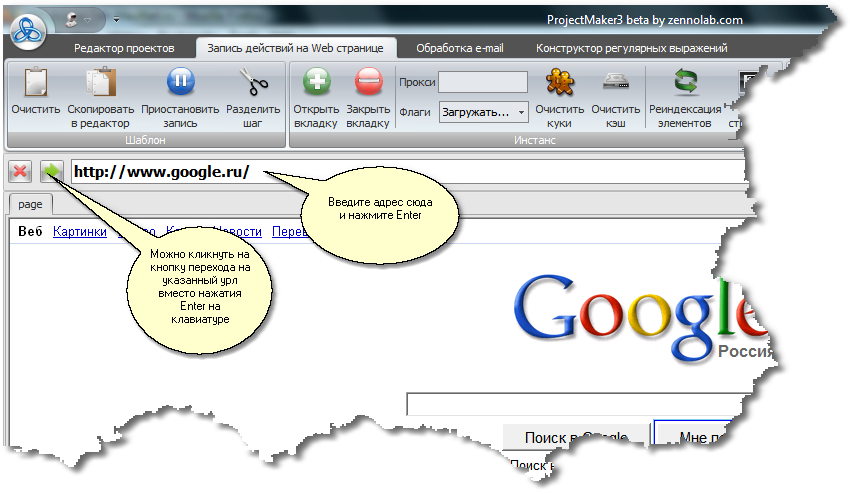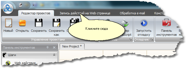 Для начала работы запустите приложение ProjectMaker из основной папки программы и выберете вторую вкладку "Запись действий на веб странице".