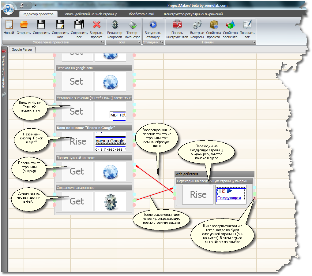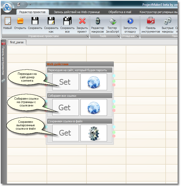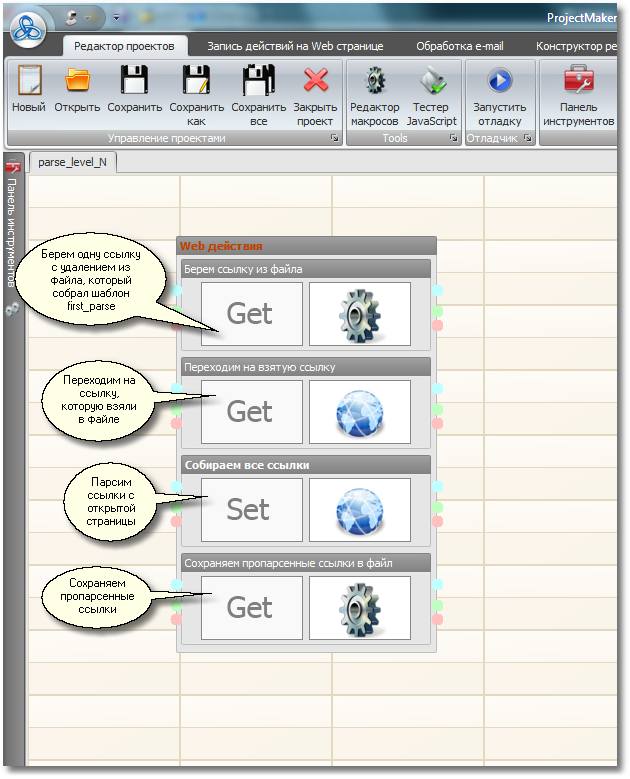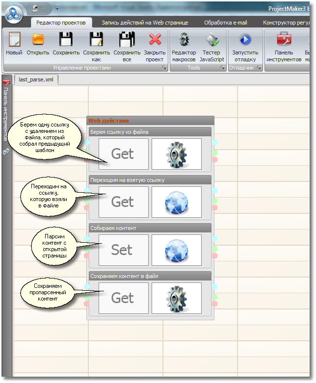 | 1. | Иногда контент лежит на всех уровнях, а не только на последнем. Тогда нужно в шаблонах второго типа тоже парсить и сохранять контент. Напоминаем, что вы можете парсить страницу сколько угодно раз в одном шаблоне (только сначала возьмите текст, а потом его парсьте регулярными выражениями с помощью соответствующих макросов, а не берите каждый раз новый текст через ветку Get--WebBrowser, т.к. это сильно нагружает процессор). |
