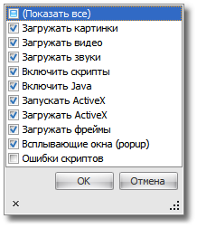 Например, отключение картинок сэкономит ресурсы подключения к интернету и процессорное время. Также рекомендуется отключать звуки, видео, загрузку и выполнение ActivX, если нет flash каптчи. Всплывающие окна можно отключить, если при переходах по страницам ресурсов "лезет" много рекламных окон. Но, если хотя бы один переход по нужным страницам происходит в новом окне, то PopUp отключать нельзя. Можно иногда, для обхода каких-либо защит, отключить выполнение JavaScript, хотя, чаще всего, они обходятся автоматически.
