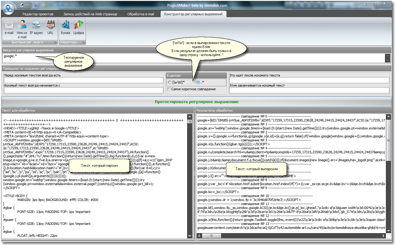 | 5. | Если все правильно и выпарсился нужный текст, то в верхнем поле можно будет забрать готовое регулярное выражение. Если что-то получилось не то, возвращайтесь к пункту 2. |