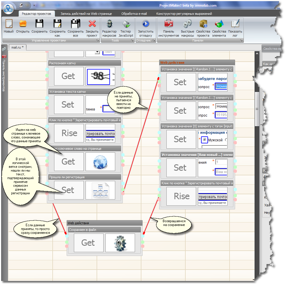 В итоге вы получите отдельный шаг повторного ввода данных, на который можно перейти, если при регистрации случилась ошибка. Далее, нужно добавить в первый шаг перед повторным вводом данных в самый конец шага две ветки. Одна ветка берет текст страницы и выпарсивает из него слово, подтверждающее прием данных сервером (проверяем успешность регистрации). Вторая ветка проверяет, выпарсилось ли это слово и если нет, то переходит на повторный ввод данных, а если да, то уходит на сохранение. Если же данные сразу ввелись хорошо, то переходим на сохранение без повторного ввода данных.