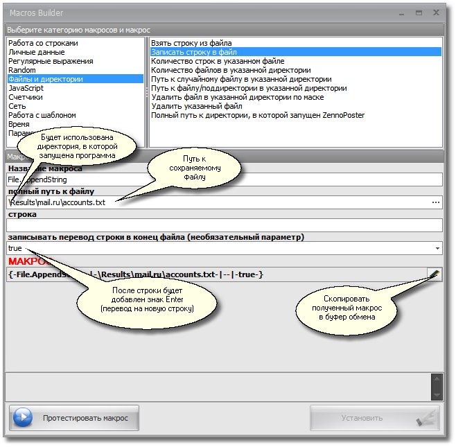 | 2. | Если путь к файлу начинается со знака ( / ) то считается, что перед этим знаком стоит путь к папке запущенной программы. Т.е. если вы написали /results/sample.txt и путь к запущенному ZennoPoster в котором вызван макрос это C:/ZennoPoster3/ZennoPoster.exe то текст будет сохранен в файл C:/ZennoPoster3/results/sample.txt |