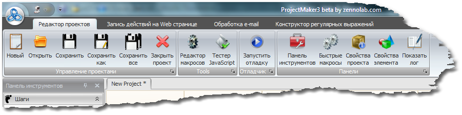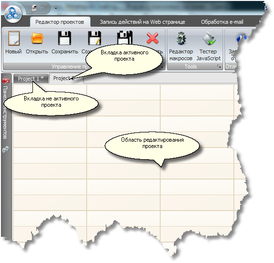 Редактор проектов состоит из кнопок управления, разделенных на тематические группы, сверху,