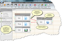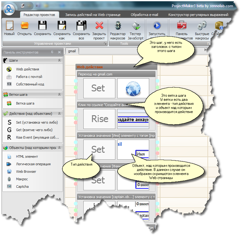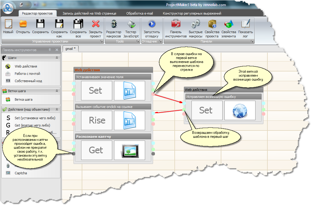 Суть всей этой схемы такова - при выполнении шаблона будут последовательно выполняться шаги от первого к последнему, внутри шагов будут выполняться ветки, тоже последовательно. Каждая ветка - это действие, например очистка куков (?), установка полей на форме, вызов событий на web странице, распознавание каптчи и т.д. (Переходы между ветками и шагами могут выполняться и не последовательно, например, при проверке успешности регистрации введена ветка логической операции, которая в зависимости от текста на странице может переключить ход работы в разных направлениях).