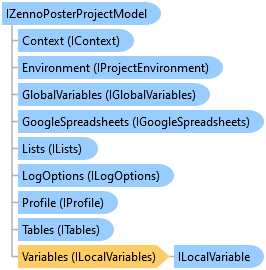 // get global variable by name "MyGlobalVariable" from namespace "MyNamespace" IGlobalVariable gv = project.GlobalVariables["MyNamespace", "MyGlobalVariable"]; // get local varible by name "MyLocalVariable" ILocalVariable lv = project.Variables["MyLocalVariable"]; // get list by name "MyList" ILists list = project.Lists["MyList"]; // get table by name "MyTable" ITables table = project.Tables["MyTable"]; // set new login to profile project.Profile.Login = "NewLogin1234"; // get nick from profile string nick = project.Profile.NickName;